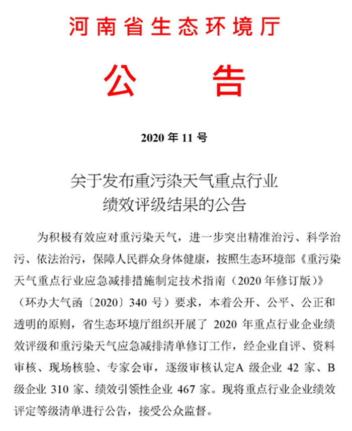 此次績效評級,是按照國家生態環境部《重污染天氣重點行業應急減排措施制定技術指南(2020年修訂版)》(環辦大氣函〔2020〕340號)有關要求,對重點行業開展的環?冃гu級,經企業自評、資料審核、現場核驗、專家會審,經河南省生態環境廳經審核認定,鄭州榮盛窯爐耐火材料有限公司被評為績效引領性企業。