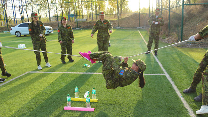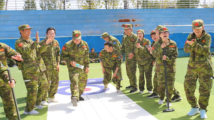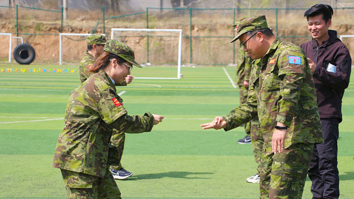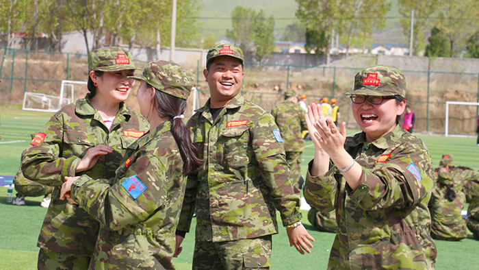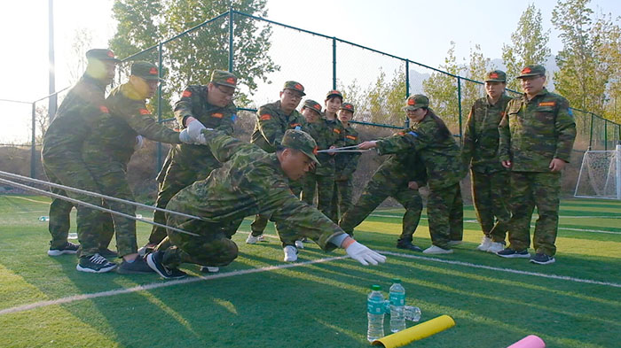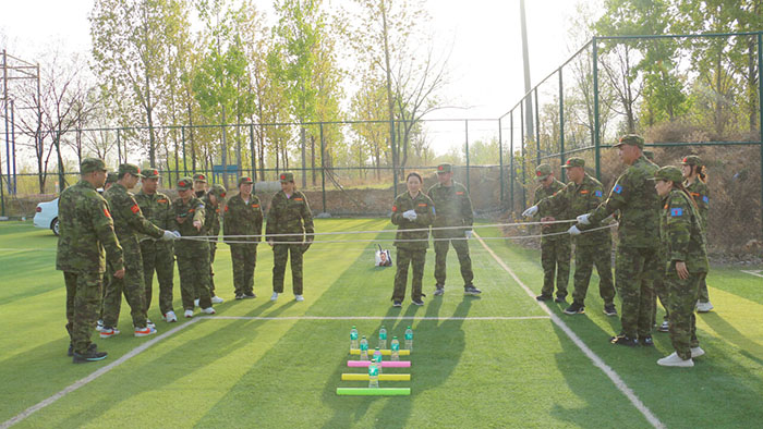 開訓前,在破冰啟航環(huán)節(jié)——【智勇通關(guān)】項目中,每組選一個大魔王來防守別隊,該隊隊員依次挑戰(zhàn)大魔王,石頭剪刀布定輸贏,贏了直接通過,輸了轉(zhuǎn)一圈,回來接著挑戰(zhàn),再輸即增加圈數(shù),直到全部隊員通過。大家把團隊當成了自己的“城堡”,在“對抗魔王”中,每個隊員都拼盡全力,期待被幸運女神光顧,期待團隊能盡早完成任務(wù),大家的歡笑聲、喝彩聲灑滿了訓練場。
