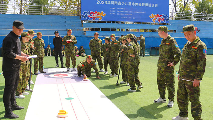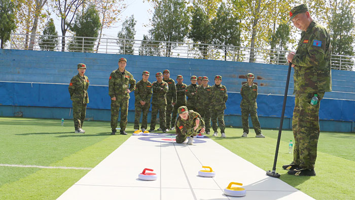 在【旱地冰壺】項目中,八個小組的隊員們一邊商榷對敵戰(zhàn)術(shù),一邊進行任務(wù)分配。隨著一聲哨響,兩個賽隊同時開賽。隊員們?nèi)褙炞ⅰ⒛耢o氣,向前邁步?jīng)_刺,揮動手臂擲壺,冰壺按照隊員們設(shè)想的路線擊打到對方的冰壺,使其滑出得分圈并穩(wěn)穩(wěn)地停留在中心點,成功得分,大家歡呼雀躍,圍觀隊員們也紛紛叫好,掌聲、歡呼聲此起彼伏,好不熱鬧。